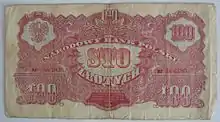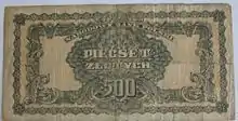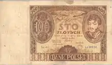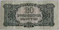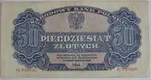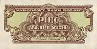 On 15 January 1945 the National Bank of Poland was formed, and a new printing plant opened in Łódź.[34] The series II and III notes were designed by Ryszard Kleczewski and Wacław Borowski. The first three series were taken out of circulation in line with legislation signed on 28 October 1950, covering the introduction of a new złoty with a revived coinage system.[35]