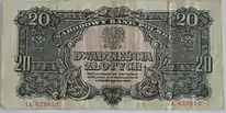 Under the occupation during World War II, the Germans created an Emissary Bank (Bank Emisyjny) in Kraków, as Polish bank officials fled to Paris in France.[30] It started operating on 8 April 1940, and in May old banknotes from 1924–1939 were overstamped by the new entity.[31] Money exchange was limited per individual; the limits varied according to the status of the person. The fixed exchange rate was 2 złoty per 1 Reichsmark.[32] A new issue of notes appeared in the years 1940–1941.[33]