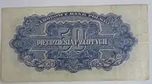 | 50 złoty | 132 × 66 mm | Blue | Casimir III the Great | Polish white eagle with royal regalia Kraków and Kazimierz |