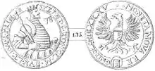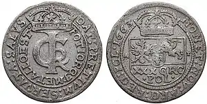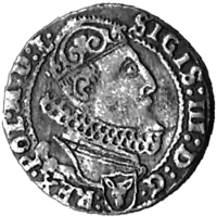 The first form of tangible currency in Poland was the denarius (denar), which circulated since the 10th century.[14] During this period, Polish coinage had a single face value and was minted from bullion, primarily silver, but also compounded with copper and other precious metals.[15] The standard unit of mass used at the time was the grzywna rather than the pound, with one grzywna being equivalent to 240 denars.[16] From the 1300s to the mid-16th century, the Prague groschen (or groat) dominated the market and its high supply reduced the demand for a national currency across Central Europe.[17] Certain cities and autonomous regions of the Polish Kingdom held the privilege of minting its own currency, for instance the shilling (szeląg) in the Duchy of Prussia, which Poland co-adopted in 1526.[18]