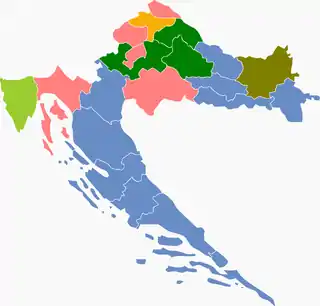 Croatia was first subdivided into counties (Croatian: županija) in the Middle Ages.[35] The divisions changed over time to reflect losses of territory to Ottoman conquest and the subsequent recapture of the same territory, and changes to the political status of Dalmatia, Dubrovnik and Istria. The traditional division of the country into counties was abolished in the 1920s, when the Kingdom of Serbs, Croats and Slovenes and the subsequent Kingdom of Yugoslavia introduced oblasts and banovinas respectively.[36] After 1945 under Communist rule, Croatia, as a constituent part of Yugoslavia, abolished these earlier divisions and introduced municipalities, subdividing Croatia into approximately one hundred municipalities. Counties, significantly altered in terms of territory relative to the pre-1920s subdivisions, were reintroduced in 1992 legislation. In 1918, the Transleithanian part of Croatia was divided into eight counties with their seats in Bjelovar, Gospić, Ogulin, Požega, Vukovar, Varaždin, Osijek and Zagreb; the 1992 legislation established fifteen counties in the same territory.[37][38] Since the counties were re-established in 1992, Croatia is divided into twenty counties and the capital city of Zagreb, the latter having the authority and legal status of a county and a city at the same time. In some instances, the boundaries of the counties have been changed, with the latest revision taking place in 2006. The counties subdivide into 128 cities and 428 municipalities.[39]