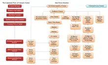 The Central Committee (CC) is the CPV's most powerful institution.[15] It delegates some of its powers to the Secretariat and the Politburo when it is not in session.[16] When the Vietnam War ended in 1975, the Vietnamese leadership, led by Lê Duẩn, began to centralise power. This policy continued until the 6th National Congress, when Nguyễn Văn Linh took power. Linh pursued a policy of economic and political decentralisation.[17] The party and state bureaucracy opposed Linh's reform initiatives; because of this, Linh tried to win the support of provincial leaders. This caused the powers of the provincial chapters of the CPV to increase in the 1990s. The CPV lost its power to appoint or dismiss provincial-level officials in the 1990s; this is proven by the fact that Võ Văn Kiệt tried to wrestle this power back to the centre during the 1990s without success. These developments led to the provincialisation of the Central Committee; for example, more and more CC members have a background in provincial party work. Because of these changes, power in Vietnam has become increasingly devolved.[18] The number of Central Committee members with a provincial background increased from a low of 15.6 percent in 1982 to a high of 41 percent in 2000. The former President of the Socialist Republic of Vietnam Trương Tấn Sang (2011–2016) was directly elected from the provinces at the 8th Party Congress, held in 1996.[19] Because of the devolution of power, the powers of the Central Committee have increased substantially; for instance, when a two-thirds majority of the Politburo voted in favour of retaining Lê Khả Phiêu as General Secretary (the leader of Vietnam), the Central Committee voted against the Politburo's motion and voted unanimously in favour of removing Lê Khả Phiêu from his post of General Secretary.[20] The Central Committee did this because the majority of its members were of provincial background, or were working in the provinces; because of this, these members were the first to feel the pinch when the economy began to stagnate during Lê Khả Phiêu's rule.[21]