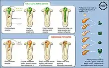 The female sporophyte must recognize the pollen stuck to the stigma. Often, only pollen of the same species can successfully grow. Outcrossed pollen grows more successfully.[8][9] With self-incompatibility systems, outcrossed pollen grows and outcompetes self pollen. The interaction between the style and the pollen detects compatibility and influences growth rate of the pollen tube.[10] This selection process relies on gene level regulation in which gene loci of the gynoecium allow either self pollen to slowly grow, stop growing or burst while faster growth of outcrossed pollen occurs. Self-incompatibility systems maintain genetic diversity.[11][12] As for gymnosperms, they do not contain a pistil with a stigma. Therefore, pollen must submerge into the pollination droplet, bringing the male gametophyte to the egg of the exposed ovule. However, pollen of different species will not submerge into the droplet; the pollen is left floating on top, while the droplet retracts back into the micropyle.[13]