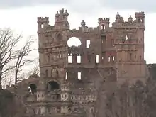 Construction ceased at Bannerman's death in 1918. In August 1920, 200 pounds of shells and powder exploded in an ancillary structure, destroying a portion of the complex. Bannerman's sales of military weapons to civilians declined during the early 20th century as a result of state and federal legislation. After the sinking of the ferryboat Pollepel, which had served the island, in a storm in 1950, the Arsenal and island were essentially left vacant.[4] The island and buildings were bought by New York State in 1967, which took possession after the old military merchandise had been removed, and the relics given to the Smithsonian. For a short time, tours of the island were given in 1968.[5] However, on August 8, 1969, fire devastated the Arsenal, and the roofs and floors were destroyed.[4] The island was placed off-limits to the public.
