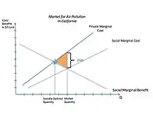 In economics, an externality occurs when the producer does not have to pay its full cost, and when it affects another party either positively or negatively. If the cost to society is greater than the cost the consumer is paying for it, then the externality is negative because it imposes this extra cost on society, which can lead to market inefficiencies. Solving the problem of negative externalities can be costly on its own, as it is often difficult to assign responsibility. Typically, the party who owns the property rights to the polluted area is responsible for paying the cost, but alternative strategies include taxing the producer or collecting payments from a determined group of individuals.[24] California suffers specifically from negative production externalities, which is when a firm's production reduces the well-being of others who are not compensated by the firm.[25]