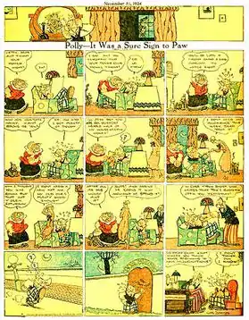 Polly and Her Pals is an American comic strip, created by cartoonist Cliff Sterrett, which ran from December 4, 1912 until December 7, 1958.[1] It is regarded as one of the most graphically innovative strips of the 20th century. It debuted as Positive Polly on December 4, 1912, in William Randolph Hearst's newspapers, initially the New York Journal, and was later distributed by King Features Syndicate.[2][3][4] The title changed to Polly and Her Pals on January 17, 1913.[1]