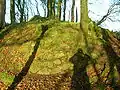 Every feudal barony had a moot and gallows hill associated with it for the meetings of the baronial court; in the case of the Eaglesham barony the Castle Hill or the Deil's (Devil's) Planting, a tree-covered knoll, possibly a tumulus or motte close to Castlehill Farm, may have been the site of a moot-hill. It has some hollows and the RCAHMS record that many years ago the 'Laird's son' went digging for gold here and found nothing. Feudal justice may have been dispensed on this 'Justice or Court Hill' and another knoll nearby named Gallowshill was where execution of the 'doom' or sentence would have taken place.[47] Ned's Mount and the Topfauld's Plantation lie off the Humbie Road. The Moot or Moat Hill in the Orry is also said to have been a moot-hill.[42]