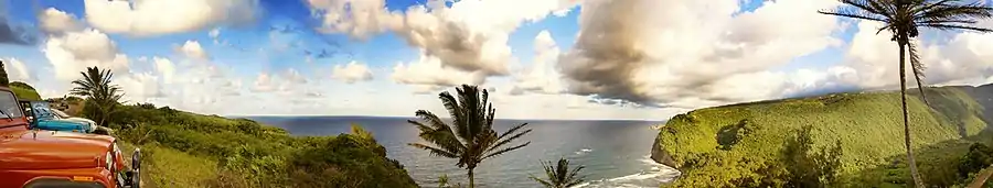 Pololū Valley is accessed from the North, from a lookout at mile 28 at the end of highway 270 [3](forming the terminus of Akoni Pule Highway) at coordinates 20°12′13″N 155°44′1″W.[4] A relatively short hike on a graded trail leads to the bottom of the valley. The trail continues beyond the valley, climbing over a ridge to neighboring Honokane Nui Valley.