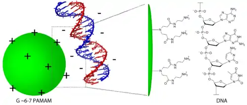 The discovery that mediating positive charge on PAMAM dendrimer surfaces decreases their cytotoxicity has interesting implications for DNA transfection applications. Because the cell membrane has a negatively charged exterior, and the DNA phosphate backbone is also negatively charged, the transfection of free DNA is not very efficient simply due to charge repulsion. However, it would be reasonable to expect charged interactions between the anionic phosphate backbone of DNA and the amino-terminated surface groups of PAMAM dendrimers, which are positively ionized under physiological conditions. This could result in a PAMAM-DNA complex, which would make DNA transfection more efficient due to neutralization of the charges on both elements, while the cytotoxicity of the PAMAM dendrimer would also be reduced. Indeed, several reports have confirmed PAMAM dendrimers as effective DNA transfection agents.[16][26][27][28]