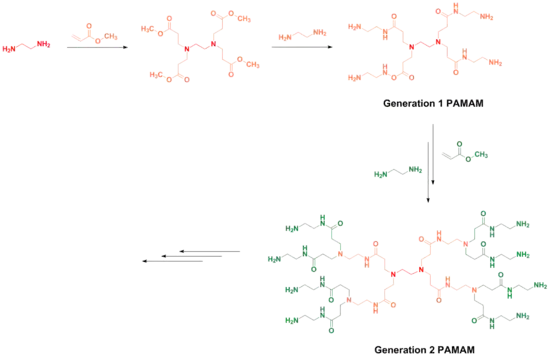 Divergent synthesis refers to the sequential "growth" of a dendrimer layer by layer, starting with a core "initiator" molecule which contains functional groups capable of acting as active sites in the initial reaction. Each subsequent reaction in the series increases the number of available surface groups exponentially. Core molecules which give rise to PAMAM dendrimers can vary, but the most basic initiators are ammonia and ethylene diamine.[6] Outward growth of PAMAM dendrimers is accomplished by alternating between two reactions: