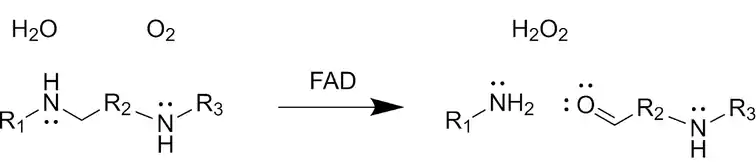 In the active site, FAD oxidizes the secondary amine to an imine, which water subsequently hydrolyzes, yielding an amino-aldehyde and a primary amine. Molecular oxygen reoxidizes the FAD, generating hydrogen peroxide.