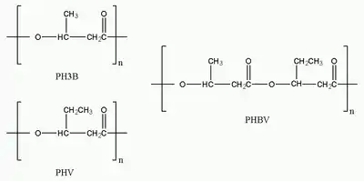 Chemical structures of P3HB, PHV and their copolymer PHBV