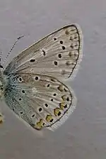 L. eros O. (= tithonus Hbn.) (80 c, d). male very bright blue, with a metallic gloss like enamel, black margin to the forewing and black distal-marginal spots to the hindwing, these spots contrasting strongly with the pure white fringes. Female brown, sometimes with yellowish red distal-marginal spots. Underside strongly recalling icarus, but male as well as female with distinct white median streak on the hindwing. In the higher mountains of southern Europe as far as the Alps, and in the mountain-districts of Anterior Asia. — In ab. petrividenda Favre the hindwing beneath has no black marginal spots, but instead a white band before the margin, ab. albipicta Schultz has a white discocellular spot on the forewing above instead of the hardly visible black one. ab. caerulescens Oberth. (80 d) are females with bright blue upperside, which occur singly and rarely in Europe, but are said to be a constant form in West China; this, however, is very improbable, and Leech says nothing about it. — erotides Stgr. [P. e. erotides Staudinger, 1892] (80 d), from the mountains of Southern Siberia, is a large, blue-green male-form, with broad black distal margin to the forewing, into which the deep black veins merge. — eroides Friv. (= anteros Frr., everos Gerh.)[P. e. eroides (Frivaldszky, 1835)] is more sky-blue than greenish blue and the largest form of the species after the following one; in Eastern Europe, particularly in Russia, the Balkan Peninsula, westwards extending to Germany, where it occurs in East Prussia and Posen, though only rarely. — The males of the South Russian form boisduvalii H.-Schiff. [P. e. boisduvalii (Herrich-Schäffer, [1843])] (80 d) have again a different blue, being paler, purer, brighter, the outer margin of the forewing is broadly black, the black veins in the apical area of the forewing being thin but sharply marked. — sutleja Moore [now full species Polyommatus sutleja (Moore, 1882)], from Kashmir, is extremely close to boisduvalii, having the same tint of blue, but its black margin is somewhat narrower and the black veins in the apical area of the forewing are not quite so sharply defined. — In amor Stgr. [now full species Polyommatus amor (Lang, 1884)] (80 e), from Ferghana and the Tian-shan, the blue of the upperside of the male has a violet sheen, nearly as in icarus, and the black margin is narrower. — napaea Gr.-Grsh. [P. e. napaea (Grum-Grshimailo, 1891)] has likewise the same blue tint above as icarus, but the black margin is much broader, as is also the costal area of the hindwing. From the Boro-Choro Mts. in Central Asia. — erigone Gr.-Grsh. [now full species Polyommatus erigone (Grum-Grshimailo, 1890)] (80 e), from the Pamir, is considerably smaller; beneath the ocelli are less prominent and the white streak of the hindwing is very distinct. Also the female bears a superficial resemblance to icarus, whose blue colour is almost exactly the same as that of the erigone males obtained at a considerable altitude (13,000 ft.). — pseuderos Moore [now full species Polyommatus pseuderos Moore, 1879] extends still further south, as far as Kashmir. The distal margin with black-grey spots above; the forewing beneath without basal ocelli and the discal row of ocelli more straight. — helena Gr.-Grsh. [now P. e. amdoensis (Wnukowsky, 1929)]from the Sinin Mts., resembles East Russian eroides, but the blue has already a slight tinge of violet, and the black margin is narrower. In the underside the rust-yellow submarginal spots are larger and the dark marginal spots are deeper black and more prominent. Perhaps bilucha Moore [now full species Polyommatus bilucha (Moore, 1884)], from Quetta, outside the Palearctic territory belongs also here — The early stages of the species do not appear to be known. The butterflies occur from June until August; they are not rare and are in the Alps among the most frequent visitors of damp places on the roads. They agree best with argus and argyrognomon in habits and flight.[3]