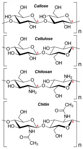 Cellulose and chitin are examples of structural polysaccharides. Cellulose is used in the cell walls of plants and other organisms and is said to be the most abundant organic molecule on Earth.[6] It has many uses such as a significant role in the paper and textile industries, and is used as a feedstock for the production of rayon (via the viscose process), cellulose acetate, celluloid, and nitrocellulose. Chitin has a similar structure, but has nitrogen-containing side branches, increasing its strength. It is found in arthropod exoskeletons and in the cell walls of some fungi. It also has multiple uses, including surgical threads. Polysaccharides also include callose or laminarin, chrysolaminarin, xylan, arabinoxylan, mannan, fucoidan and galactomannan.