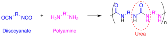 Polyurea is a type of elastomer that is derived from the reaction product of an isocyanate component and a synthetic resin blend component through step-growth polymerization. The isocyanate can be aromatic or aliphatic in nature. It can be monomer, polymer, or any variant reaction of isocyanates, quasi-prepolymer or a prepolymer. The prepolymer, or quasi-prepolymer, can be made of an amine-terminated polymer resin, or a hydroxyl-terminated polymer resin.[1]