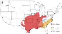 | Subspecies range map in the United States. Red: red-eared slider (also in Mexico) Yellow: yellow-bellied slider Blue: Cumberland slider | |