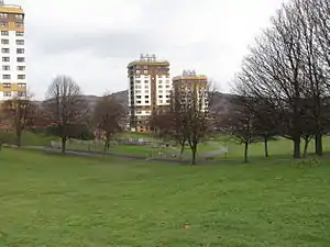In the 1960s the area was a bare open bowl but much appreciated and used by the local community for games and community events. Since then there has been much development. The upper part of the Ponderosa is clothed in woodland, scrub, meadow and rough grassland which gives a fine environment for wildlife. Foxes and kestrels are often seen, and there is a wealth of bird and butterfly species. The upper part also contains an adventure playground and a mini football pitch. In 1999 the Crookes Valley Road entrance was given new gateway pillars, with each pillar consisting of three carved telegraph poles.[4] The lower part of the Ponderosa stands in the shadow of seven tower blocks on its western side and St Stephen's church on Fawcett Street on its eastern. This lower area has a children's playground and several wooded copses.[5]