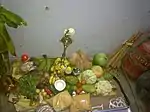 The cooking is done in a clay pot that is often garlanded with leaves or flowers, sometimes tied with a piece of turmeric root or marked with pattern artwork called kolam. It is either cooked at home, or in community gatherings such as in temples or village open spaces.[32] It is the ritual dish, along with many other courses prepared from seasonal foods for all present. It is traditionally offered to the gods and goddesses first, followed sometimes by cows, then to friends and family gathered. Temples and communities organize free kitchen prepared by volunteers to all those who gather.[11][33] According to Andre Bateille, this tradition is a means to renew social bonds.[2] Portions of the sweet pongal dish (sakkara pongal) are distributed as the prasadam in Hindu temples.[8]