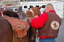 Most Pony Express saddles and mochilas were made by Israel Landis' shop in St. Joseph, Missouri.[9] Israel made the entire saddle about one-third the weight of the ordinary Western saddle.[5] The specially designed saddle with its mochila weighed less than 13 pounds.[5] The saddles and mochilas were standardized so they would work from one horse to another. When full of mail and telegrams, the mochila weighed about 20 pounds.[2] The rider would also carry a canteen of water, a gun and a small Bible that included the solemn Pony Express loyalty oath.[10][11] The saddles for the horses that traveled over the Overland Pony Express route were special and standardized, built by a saddlery firm owned and franchised by Landis.