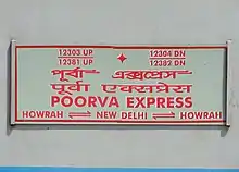 The 12303 / 12304 Poorva Express are daily superfast express trains of Indian Railways running between Howrah, West Bengal, and New Delhi, the capital city of India. The name Poorva signifies the eastern part of India, and the train attracts travellers from Bihar, Jharkhand & West Bengal.[1][2]