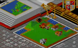 The main action window in Populous is viewed from an isometric perspective, and it is set in a "tabletop" on which are set the command icons, the world map (depicted as an open book) and a slider bar that measures the level of the player's divine power or "mana".