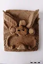 The inner courtyard held the main complex which consisted of a two-part central structure and two flanking galleries. The two buildings of the central structure, one behind the other, stood on square platforms which had been built up of clay layers and faced with bricks which were coated with lime plaster. The larger building was subdivided by wattle-and-daub panels into two halls and a series of smaller rooms. Walls and panels were covered with lime plaster which was painted with geometric designs and horizontal red stripes; the presence of two layers of plaster of different quality suggests repairs. The tiled roof had been supported by 36 wooden columns resting on stone bases. The building appeared to be of post-and-beam construction characteristic of Chinese T’ang architecture; this is indicated by burnt timber fragments of interlocking wooden brackets in the Chinese style called dougong.[9] The decorative eave end-tiles recovered from the site are broadly analogous to those found in Tang contexts, however recent studies indicate they form part of a distinctive Uyghur stylistic typology.[10]