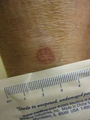 - Porokeratosis palmaris et plantaris disseminata is characterized by skin lesions that are superficial, small, relatively uniform, and demarcated by a distinct peripheral ridge of no more than 1mm in height.[1]: 534 [2]: 1668 [3]: 567