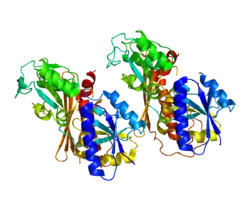 The structure of 40-42 kDa porphobilinogen deaminase, which is highly conserved amongst organisms, consists of three domains.[5][6] Domains 1 and 2 are structurally very similar: each consisting of five beta-sheets and three alpha helices in humans.[7] Domain 3 is positioned between the other two and has a flattened beta-sheet geometry. A dipyrrole, a cofactor of this enzyme consisting of two condensed porphobilinogen molecules, is covalently attached to domain 3 and extends into the active site, the cleft between domains 1 and 2.[8] Several positively charged arginine residues, positioned to face the active site from domains 1 and 2, have been shown to stabilize the carboxylate functionalities on the incoming porphobilinogen as well as the growing pyrrole chain. These structural features presumably favor the formation of the final hydroxymethylbilane product.[9] Porphobilinogen deaminase usually exists in dimer units in the cytoplasm of the cell.