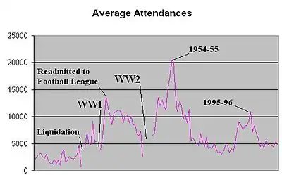 The club were relegated for the first time at the end of the 1928–29 season, going from the Second Division to the Third Division North.[19] They came up as champions the following season and in the 1930–31 season were placed fifth in the second tier of English football, their highest ever league finish.[20] Vale went to beat Chesterfield by a club record 9–1 margin on 24 September 1932.[21] However, after these achievements the club were once again relegated in the 1935–36 season and remained in the third tier until World War II.[22]