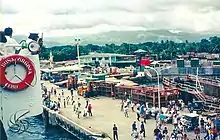 1980s scene of William Lines ship, Doña Virginia docking at the busy and crowded city main port, Dumaguete City.