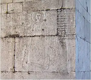 On the right jamb of the gate there is also a carved figure portraying Archangel Michael killing a drake, alongside of a blackletter inscription written in Medieval Latin, that commemorates the battle fought on 29 September 1327 (the day of Saint Michael) by Roman Ghibelline militiamen of the Colonnas, led by Giacomo de’ Pontani (or Ponziano), against the Guelph army of Robert of Anjou, King of Naples, led by John II and Gaetano Orsini: