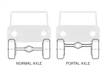 Portal axles (or portal gear lifts) are an off-road vehicle suspension and drive technology where the axle tube or the half-shaft is off-set from – usually above – the center of the wheel hub and where driving power is transferred to each wheel via a simple gearbox, built onto each hub.[1] This gives two advantages: ground clearance is increased, particularly beneath the low-slung differential housing of the main axles — and secondly, any hub reduction gearing allows the axle halfshafts to drive the same power but at reduced torque (by using higher shaft speed). This reduces load on the axle crownwheel and differential.