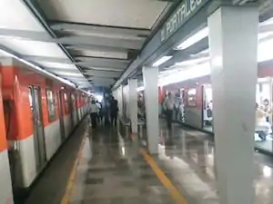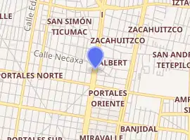 Portales is a station on Line 2 of the Mexico City Metro system.[2][3] It is located in the Colonia Albert and Colonia Portales neighborhoods of the Benito Juárez borough of Mexico City, directly south of the city centre in the median of Calzada de Tlalpan.[2] It is a surface station.