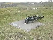 During the Second World War, Porthcurno was designated a Vulnerable Point and was heavily defended and fortified as a part of British anti-invasion preparations. At the beginning of the war a small guard of special constables was put on duty at the cable office and cable house, later superseded by a platoon of soldiers who camped on a former bowling green.[12] Porthcurno valley was declared a protected place and as many as 300 troops were deployed in the immediate area to guard the station.[42] Passes were issued to residents and visitors who had business to be in the area and many mock attacks were staged.[43] The defences included pillboxes and a petroleum warfare beach flame barrage[44] which could be operated remotely from the tunnel.[42] At the end of the War, although some 867 bombs fell in the (Penzance) area and 3,957 houses were damaged or destroyed, the only damage suffered by any communications equipment at Porthcurno was the destruction of an antenna when a bomb fell at Rospletha Farm, located at the top of the hill about half a mile to the west of the cable office.[12]