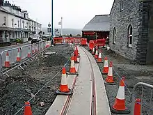 ![]() Porthmadog Harbour railway station in 2011. The point work of the WHR's Cross Town Rail Link (CTRL) can be seen in the foreground, with the FR's 0-4-0 locomotive Palmerston waiting in the then single platform station to pilot a WHR train back into the platform from the Cob | |