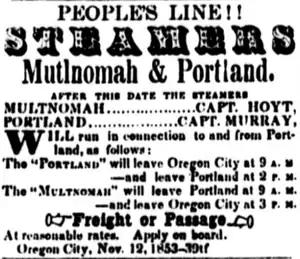 For a brief period starting in 1853 Portland, under captain A.S. Murray, and Multnomah, under Capt George W. Hoyt, were combined together as the People's Line.[2][3][5] This was the first merger of steamboat interests on the river.[5] As of November 12, 1853 Portland would leave Oregon City daily at 9:00 a.m. for Portland, and leave Portland at 2:00 p.m. on the return trip to Oregon City.[6] Multnomah left Portland at 9:00 a.m. for Oregon City, and departed Oregon City in the afternoon, at 3:00 p.m. to return to Portland. As of April 21, 1855, under Capt. A.S. Murray, Portland was running on a daily route between Oregon City and Portland, departing Oregon City at 8:00 a.m., and leaving Portland at 2:00 p.m.[7]