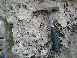 Portland Admiralty Roach is a kind of stone from the Isle of Portland used to construct "The Cobb", the well-known seawall at Lyme Regis in Dorset. The stone is rich in fossils (known as shells to local masons) often consisting of almost fifty percent fossilized remains with an average size of approximately 350 mm. The stone, which was quarried by Albion Stone, has a maximum bed height of 2 metres. The stone is renowned for being highly frost resistant and being able to withstand the chemical effects of seawater. The stone is an open textured oolitic limestone from the Portlandian formation formed during the Tithonian age, (152.1 ± 4 Ma to 145.0 ± 4 Ma (million years ago)) of the Late Jurassic epoch. It is formed from ooliths in a micrite (fine grained calcium carbonate) matrix. There are many voids in the stone, caused by percolating rainwater dissolving all or parts of its many shell fossils, mainly bivalves and gastropods.