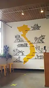 Portland Cà Phê is a coffee shop in southeast Portland's Creston-Kenilworth neighborhood. Drinks on the menu include Vietnamese iced coffee, rose matcha, and an ube latte with ube root extract.[1] According to Willamette Week's Andrea Damewood, Portland Cà Phê is among the few Portland establishments serving cheese foam (blended whipped cream, cream cheese, and sea salt). She called the business "a low-key second outpost" of House of Banh Mi, a Vietnamese restaurant owned by the mother of Portland Cà Phê's owner. The coffee shop serves bánh mì with House of Banh Mi's "signature" egg butter, pickled carrots and daikon, cilantro, cucumber, and jalapeño. Coffee cinnamon rolls and "pastry pop tarts" from Jen's Bagels and Pastries are also available.[1]