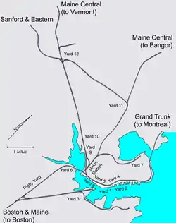 ![]() Map of the Portland Terminal Company and connecting lines, circa 1960 | |