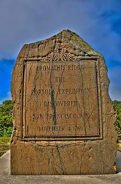 Sergeant Ortega, contacting a group of Indians, thought they were trying to notify him of a ship anchored somewhere up north; for weeks, the men of the expedition had sought desperately for a harbor with a ship laden with food supplies. Heading a party of scouts up and over Montara Mountain, Ortega reached the area now known as Devil's Slide. They found their northward advance blocked by the mouth of a vast bay they could not identify — known today as San Francisco Bay.[18] Ortega and his scouts turned back south along the west shore of the bay, around the southern end and back up the east side. However, they only got as far as present-day Hayward before turning back — because their allotted three days were up. When the scouts returned and described what they had seen, Portolà led the entire party up into the hills, to a place where the entire San Francisco Bay was visible. Only friar Crespí seemed to grasp the importance of the bay, describing it in his diary as "a very large and fine harbor, such that not only all the navy of our Most Catholic Majesty but those of all Europe could take shelter in it."