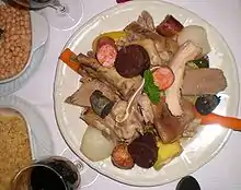 Many other meat dishes feature in Portuguese cuisine. In the Bairrada area, a famous dish is Leitão à Bairrada (roasted suckling pig). Nearby, another dish, chanfana (goat slowly cooked in red wine, paprika and white pepper) is claimed by two towns, Miranda do Corvo ("Capital da Chanfana")[21] and Vila Nova de Poiares ("Capital Universal da Chanfana").[22] Carne de porco à alentejana, fried pork with clams, is a popular dish with some speculation behind its name and its origin as clams wouldn't be as popular in Alentejo, a region with only one sizeable fishing port, Sines, and small fishing villages but would instead have a much popular usage in the Algarve and its seaside towns. One of the theories as to why the plate may belong to the Algarve is that pigs in the region used to be fed with fish derivatives, so clams were added to the fried pork to disguise the fishy taste of the meat.[23] The dish was used to test Jewish converts’ new Christian faith; consisting of pork and shellfish (two non-kosher items), Cristãos-novos were expected to eat the dish in public in order to prove they had renounced the Jewish faith.[24] In Alto Alentejo (North Alentejo), there is a dish made with lungs, blood and liver, of either pork or lamb. This traditional Easter dish is eaten at other times of year as well. Alcatra, beef marinated in red wine, garlic and spices like cloves and whole allspice, then roasted in a clay pot, is a tradition of Terceira Island in the Azores.