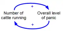 Causal loop diagram that depicts the causes of a stampede as a positive feedback loop.