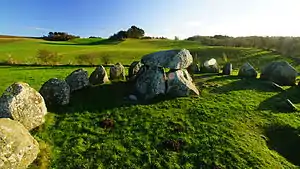 Poskær Stenhus is the largest round barrow in Denmark, dating back to 3.300 B.C. It is by the village Knebel on the hilly southern part of the peninsula, Djursland, at the entrance to the Baltic Sea between Denmark and Sweden in northern Europe.[1] The central burial chamber is equipped with a capstone weighing 11 tonnes (12 tons), surrounded by 23 slabs taller than a man, forming a circle.[1]