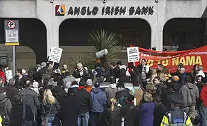 The Irish Stock Exchange (ISEQ) general index, which reached a peak of 10,000 points briefly in April 2007, fell to 1,987 points—a 14-year low—on 24 February 2009 (the last time it was under 2,000 being mid-1995).[7] In September 2008, the Irish government—a Fianna Fáil–Green coalition—officially acknowledged the country's descent into recession; a massive jump in unemployment occurred in the following months. Ireland was the first state in the eurozone to enter recession, as declared by the Central Statistics Office (CSO).[8] By January 2009, the number of people living on unemployment benefits had risen to 326,000—the highest monthly level since records began in 1967—and the unemployment rate rose from 6.5% in July 2008 to 14.8% in July 2012.[9] The slumping economy drew 100,000 demonstrators onto the streets of Dublin on 21 February 2009, amid further talk of protests and industrial action.[10]