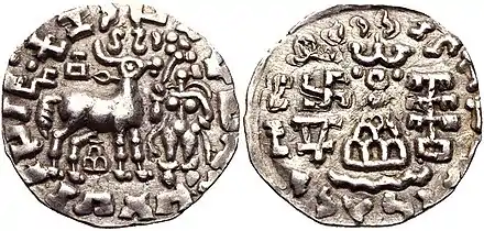 Coin of Dharaghosha, king of the Audumbaras, in the Indo-Greek style, circa 100 BCE.[15]