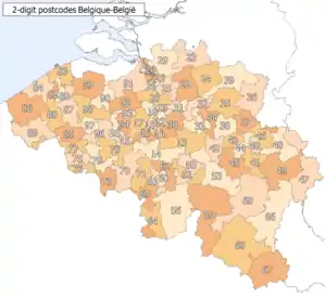 Postal codes in Belgium are numeric and consist of 4 numbers. The first digit indicates the province (except for the 3xxx numbers that are shared by the eastern part of Flemish Brabant and Limburg, the 6xxx that are shared between the Hainaut and Luxembourg province, and the 1xxx that are shared by the Brussels Capital Region, the western part of Flemish Brabant and Walloon Brabant). The more zeros there are, the higher the number of inhabitants of that city in the province. For example: Bruges (Brugge) is the capital and largest urban centre of the coastal province of West Flanders so it gets the 8000 code, the second city is Kortrijk and gets 8500. When writing the address, the postal code is put in front of the town name.