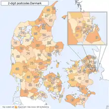 Postal codes in Denmark are determined by a four digit system that was implemented 1967. The only exceptions are five special purpose 3-digit codes. The self-governing territory of Greenland[1] is part of the Danish system (39xx). Historically, the Faroe Islands also formed part of the Danish postal code system using the 38xx range and the prefix "FR", but this was changed to a new format consisting of a three-digit code and the country code "FO", with FR 3800 Tórshavn becoming FO-110 Tórshavn.[2]