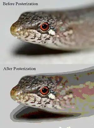 Posterization or posterisation of an image is the conversion of a continuous gradation of tone to several regions of fewer tones, causing abrupt changes from one tone to another. This was originally done with photographic processes to create posters. It can now be done photographically or with digital image processing and may be deliberate or an unintended artifact of color quantization.