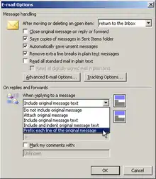 Yahoo! does not have the option "Quote the text of the original message" in Mail Classic, but this setting is retained after turning it on in All-New Mail and then switching back to Mail Classic. Inline replying is broken in Microsoft Outlook, which despite choosing the setting to prefix each line of the original with the "greater-than" character (>) produces a blue line that makes answers inserted between quotes of an HTML email look like part of the original. The workarounds are to use the setting "read all standard mail in plain text", or to use the "Edit Message" option on the original email and convert it to plain text before replying (then discard the edited version).[16]