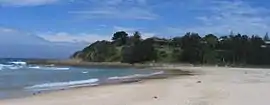 To the north lies the Beachcomber Holiday Park and Lake Brunderee. This small tidal lake is connected intermittently to the ocean by Potato Creek, and is a major habitat for swans and chestnut teal, as well as an important drought refuge. In 1999 the lake was declared a habitat protection zone due to its importance as a fish spawning ground.[2] To the south lies a small shallow, and often dry unnamed coastal lake which abounds in bird-life at various times of the year. Horse trails snake through the hinterland. Local fauna includes eastern grey kangaroos, red-necked wallabies, bandicoots, emus, echidnas, eastern rosellas, crimson rosellas and sea eagles.